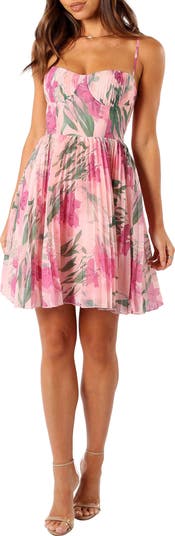Pleating at the bust and skirt lends gorgeous texture to this romantic chiffon dress covered in a dreamy floral print.