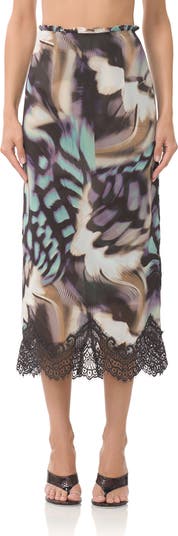 Scalloped lace trim at the hem romances this printed midi skirt featuring a flourish of sweet ruffles at the waist.
