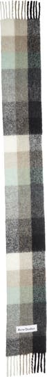 Buffalo checks lend classic style to a sweeping, oversized wool scarf trimmed with fluttery fringe.