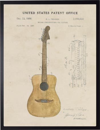 This vintage-inspired print, framed in a black wooden frame, features an acoustic guitar patent. Sized at 16 inches by 20 inches, this made in the USA frame makes for a beautiful addition to any wall.