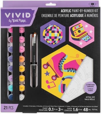 - EASY STEP-BY-STEP PROCESS: Just match the pre-numbered paint pots to the numbered areas on the canvas, fill them in, then wash your brush between colors—ideal for beginners and stress-free for seasoned creatives, too.COMPLETE ART KIT: Includes three canvases, two quality brushes, and 16 paint pots, plus detailed instructions so you have everything needed to create vibrant retro artwork and proudly display your finished pieces.