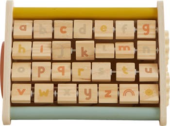 Your child will get three sides of fun with this colorful wooden activity triangle featuring a maze, mirror, gears, peek-a-boo numbers, an alphabet abacus and two-sided graphics.