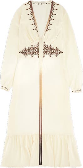 The ADA dress by Fortela is a bohemian-chic inspired chemisier-dress that has its roots in the 50s, when the chemisier became popular as a versatile, feminine and practical garment, combining the elegance of a dress with the functionality of a shirt. This style, which can easily adapt to different occasions, always maintains a sophisticated touch. The ADA dress by Fortela takes up this tradition, enriching it with unique details and a craftsmanship of the highest quality. Crafted from 100% ivory silk crepe de chine with refined tobacco embroidery, the dress has a slim and feminine fit, accentuated by the bustier effect enriched with embroidery. The central V-neckline, embellished with a hidden fastening with fine mother-of-pearl buttons, adds a touch of sophistication, enhancing the décolleté. Navajo-inspired embroidery decorates the central part, fully reflecting Fortela's distinctive style. The lower part of the skirt features a central slit and a flounce at the bottom that gives movement to the garment, all outlined by a dégradé edge in perfect boho style. On the back, the iconic Fortela stitching made with orange thread embodies the philosophy of the brand, which creates each garment with the intention that it lasts over time and evolves together with the wearer, carrying with it a piece of history, reinterpreted through the inspiration and study of Alessandro Squarzi.