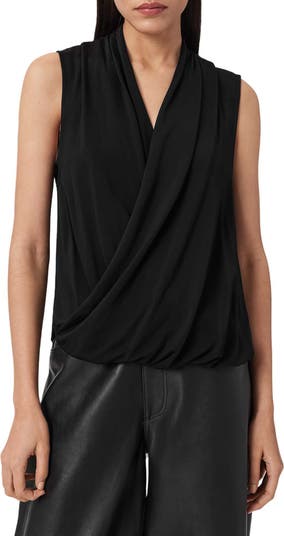 An asymmetrical faux-wrap front shapes this sleek tank, while its draped bubble hem delivers modern structure with quiet edge.