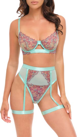 Adaline Embroidered Mesh Underwire Bra & Thong with Garter Straps Set