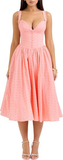 Wax nostalgic in this '60s-inspired midi designed with a shaping corseted bodice and a perfectly flared skirt.