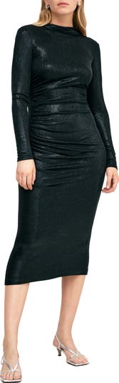 Elevate your cocktail-hour ensemble with this shimmery long-sleeve dress featuring subtle ruching.