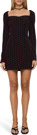 Feel ultrasassy on date night in this stretch-kissed polka-dot minidress designed with a sweetheart neckline and fluted long sleeves.