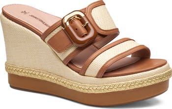 A chunky buckle glints against the woven raffia upper of a lofty slide sandal set on a mixed-media platform and towering wedge heel. A foam-cushioned footbed with built-in arch support promotes lasting comfort.