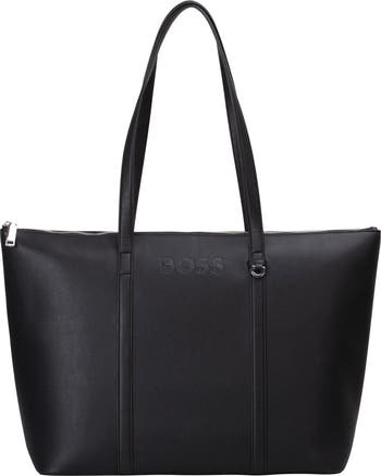 A debossed block-letter logo adds a clean, minimalist brand signature to this spacious tote made from richly pebbled faux leather.