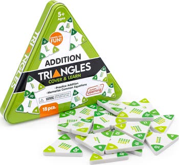 ADDITION TRIANGLES - Hands-On Math Made Simple! Make early math concepts click with Addition Triangles, a durable set of melamine plastic triangles designed to teach addition and subtraction through hands-on, visual learning. Memorize common equations! Each triangle shows a sum at the top and addends at the bottom, allowing children to cover numbers and practice joining, separating, or finding the missing number. A color-coded visual representation in the center reinforces understanding, turning abstract math into concrete, accessible learning. Perfect for classroom centers, small groups, tutoring, or home practice, Addition Triangles build confidence, fluency, and number sense helping young learners master essential math skills with ease and fun. Addition Triangles make early math feel simple, engaging, and intuitive by transforming abstract concepts into hands-on learning experiences that young students can easily grasp. Their sturdy construction ensures long-term use, and their interactive format makes math both accessible and fun, allowing children to explore equations independently or with guidance while building the foundational skills they need for future success.