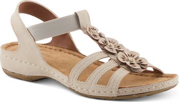 A stretchy elastic strap secures this floral-embellished T-strap sandal boasting a cushy comfort footbed and a walkable grip sole.