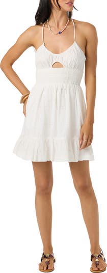 Eyelet embroidery details a party-ready minidress with a half-moon cutout at the waist and adjustable straps that tie at the back.