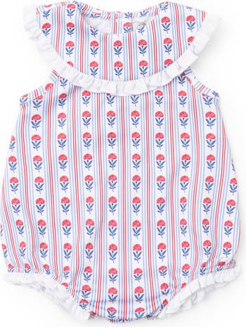 Girls' pima cotton bubble with ruffled yoke collar and ruffles around legs. Snaps in stride and back of neck. Made from 100% Peruvian Cotton.