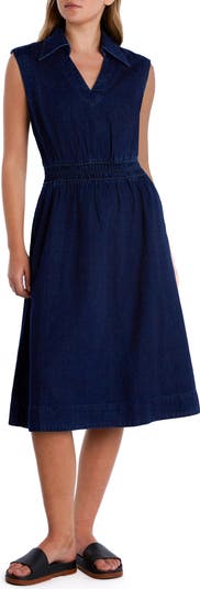 Every closet craves this sleeveless denim dress designed in an easy A-line silhouette.