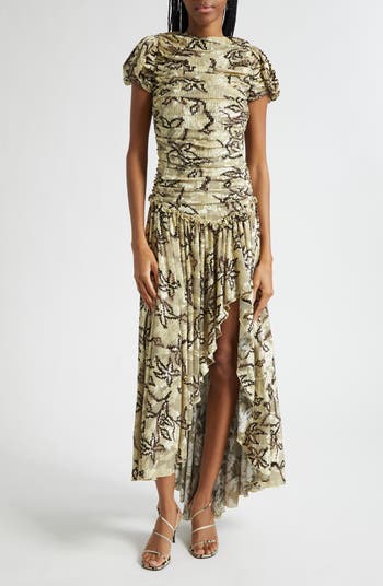 Each season, the Turkish brand whisks us away to Siedrés—an imaginary Mediterranean town you might breeze through in this artfully gathered and ruffled maxi dress with an open back that promises a memorable exit.