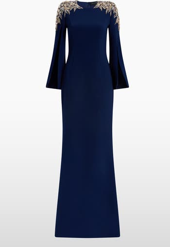 This evening gown combines sleek tailoring with dramatic embellishment, featuring a floor-length column silhouette enhanced by flowing cape sleeves. Intricate beadwork at the shoulders creates a striking focal point, catching the light with every movement and adding couture-inspired detail. The clean lines of the gown contrast beautifully with the opulent decoration, delivering a balance of modern simplicity and high-impact glamour. Perfect for gala dinners, formal receptions, or red carpet appearances, this gown offers an unforgettable statement of elegance.