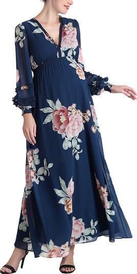 Classically feminine, this flowing maxi dress is nipped at the waist for a flattering baby-doll look. Ruffle cuff sleeves and an alluring V-neckline tie this piece together.