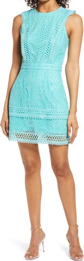 Figure-flattering seams define the borders between floral and geo-patterned lace on this fit-and-flare dress with a modern take on a romantic look.