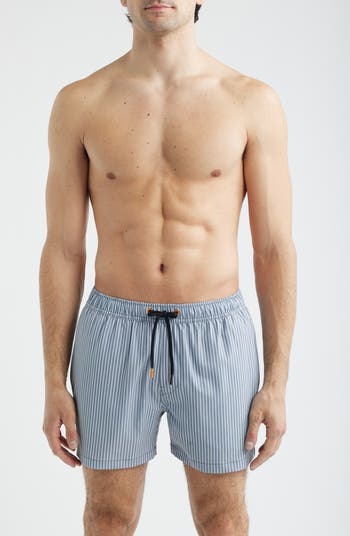 A stretchy drawstring waist adds all-day comfort to these lightweight swim trunks made with on-seam pockets.