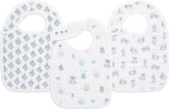 Cheerful prints decorate absorbent muslin bibs featuring an adjustable snap-tab at the neck designed to grow along with your little darling.
