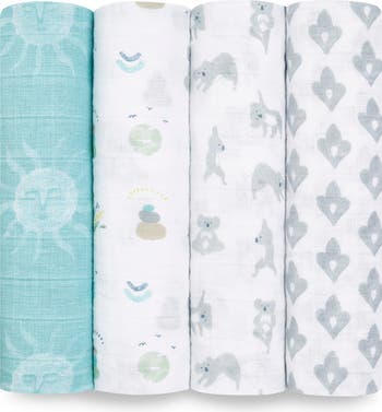 Extra-large swaddling cloths made of breathable cotton muslin have a light, open weave that allows a baby's body temperature to regulate itself naturally. Sweet sketches pattern the cloths that are also handy for nursing, for use in the stroller or as portable crib sheets.