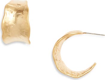 A hammered finished gives an organic-inspired glint to everyday hoop earrings plated in gleaming 18-karat gold.