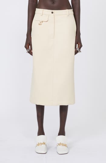 This slim cotton-blend twill pencil skirt is constructed with a decorative flap that hold a gleaming 'S' ornament finished with ball endcaps to polish off the tailored look.