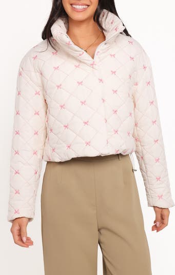 Puffy diamond quilting texturizes a cropped jacket that's covered in embroidered bows so you can combat the chill while channeling the trendy coquettish aesthetic.