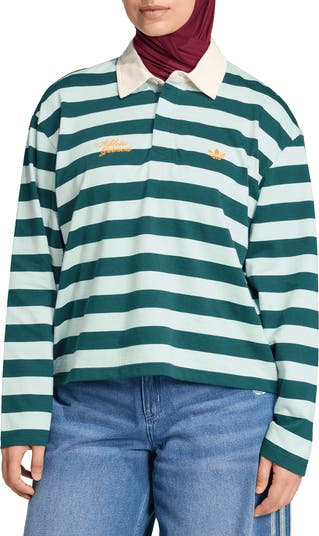 Old school school spirit runs through every stripe of this oversized rugby shirt embroidered front and back with iconic branding.