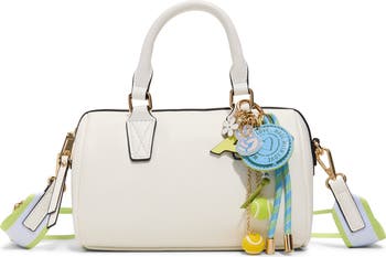 A collection of sporty and colorful charms enliven the removable key fob on a richly textured faux-leather satchel shaped in a structured profile and suspended from an optional webbing strap.