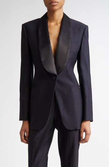 Tonal shawl lapels lend black-tie elegance to this wool-and-silk blazer shaped into a fitted hourglass silhouette via gathers at the back.