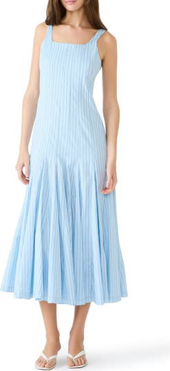 This stretch-cotton sundress pairs crisp pinstripes with an easy, modern silhouette. Designed with a square neckline and dropped waist, it finishes with a gored midi skirt that creates fluid movement and a flattering fit-and-flare shape.