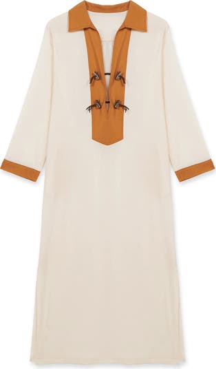 The Fortela Women's kaftan dress is crafted from a soft lyocell blend. A timeless piece with its relaxed fit and classic collar. The bi-color design and side slits add sophistication, while the camoscio laces enhance the neckline. Made in Italy, this garment embodies Fortela's commitment to quality and enduring style.