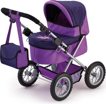 Trendy is a beautiful doll's pram, in fashionable colors and is suitable for dolls up to 18". With its adjustable handle, this pram is already suitable for the smallest girls, and will grow with them. With its four big wheels it is suitable also for uneven grounds. Furthermore the pram can be folded up quickly for transportation. Conveniently, the integrated shopping basket can store everything, which is needed for a trip with the doll's mum and her little darling.
