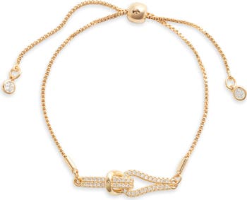 Small crystals twinkle at the center of a slender bracelet plated in high-shine 14-karat gold.