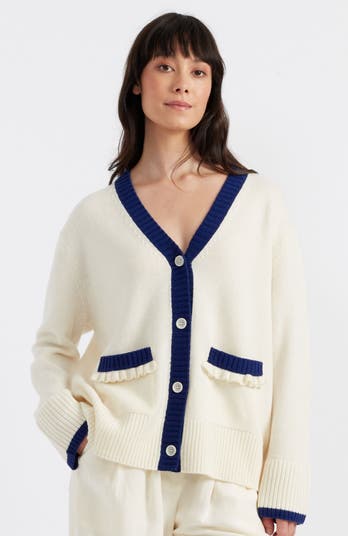 At Chinti & Parker, we love to create classic knitwear with an unexpected twist. This cream cardigan, knitted from a mid-weight blend of wool and cashmere is a stylish case in point. It has navy trims and sweet ruffles at the pockets. The oversized fit exudes effortless appeal.
