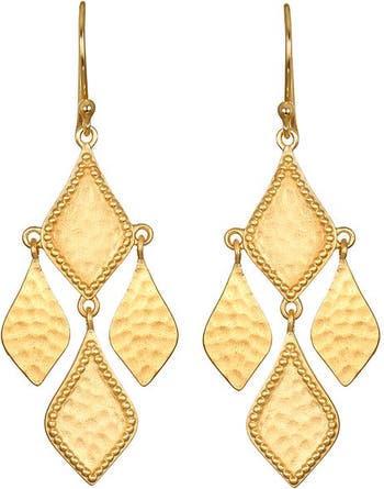 The light that shines upon you is matched by the light you carry within; let it illuminate your path so you may seek your truth. Chandelier earrings of hammered 18kt gold plate petals catch the light as they flutter, creating an effortless, elegant look.Throughout the world, the lotus represents new beginnings, rebirth and infinite potential. In nature, the lotus roots itself in mud, arising daily from the murky water to burst into bloom.