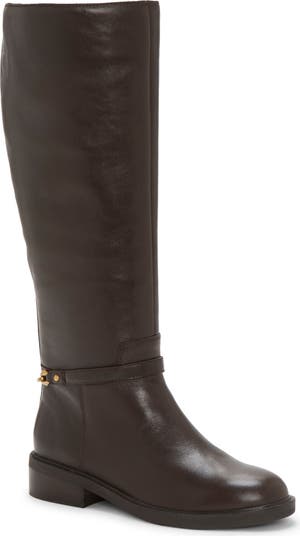 Equestrian-inspired bit hardware wraps the ankle of a knee-high boot featuring a rich leather upper and fastened with a full-length side zipper.