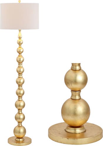 A cascading row of stacked gold balls forms the base of this floor lamp, giving any reading nook or living area a polished, contemporary look. A cotton shade keeps things casual, while the gold painting finish is decidedly glam. From the matching gold finial to the silk-wrapped cord, no design detail was overlooked in the creation of this statement-making piece.
