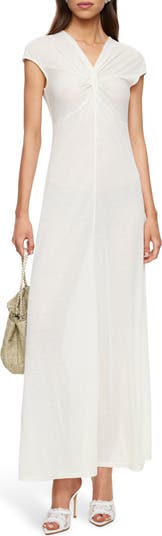 A textured front twist enhances the shape and dimension of this lightweight maxi framed by cap sleeves and finished with a drapey skirt.