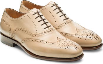 Brogue perforations and wingtip styling bring retro-cool dimension to a Spanish-made oxford shaped from burnished leather and featuring a cushioned footbed.