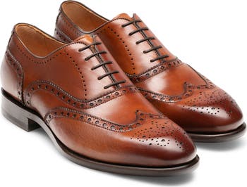 Brogue perforations and wingtip styling bring retro-cool dimension to a Spanish-made oxford shaped from burnished leather and featuring a cushioned footbed.