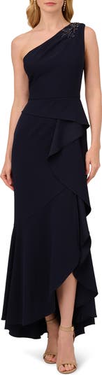 Glistening beads embellish the shoulder of this elegant gown cut from a knit crepe fabric that beautifully drapes.
