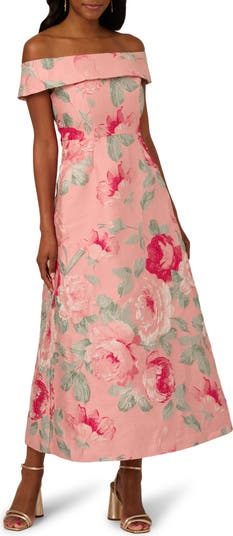 Make a sophisticated statement at your next special occasion with this shoulder-baring dress in stunning floral jacquard.