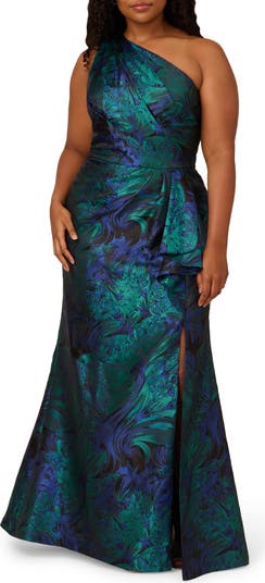 Elegantly draped ruffles accent the waist of this stunning jacquard gown that's perfected by a regal one-shoulder neck.
