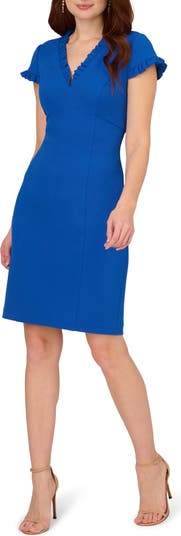 Soft ruffles elevate this stunning sheath dress designed with princess seams and made of a textured pebble crepe.