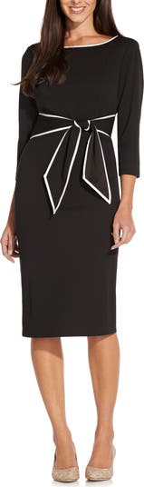 A tipped trim emboldens the tied front of a three-quarter-sleeve dress that brings refined style to your wardrobe.