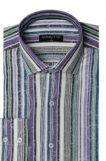 A jacquard grid adds subtle dimension to a woven-cotton sport shirt cut for a modern shape-fit that looks good tucked or untucked.