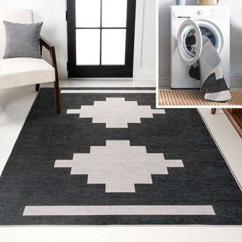 Inspired by moroccan designs, our machine washable geometric rug has minimalist simplicity. The double medallion pattern is woven in a modern, two-tone color palette. Add graphic punch to your living room, dining room, entry, or bedroom with this easy-care rug.